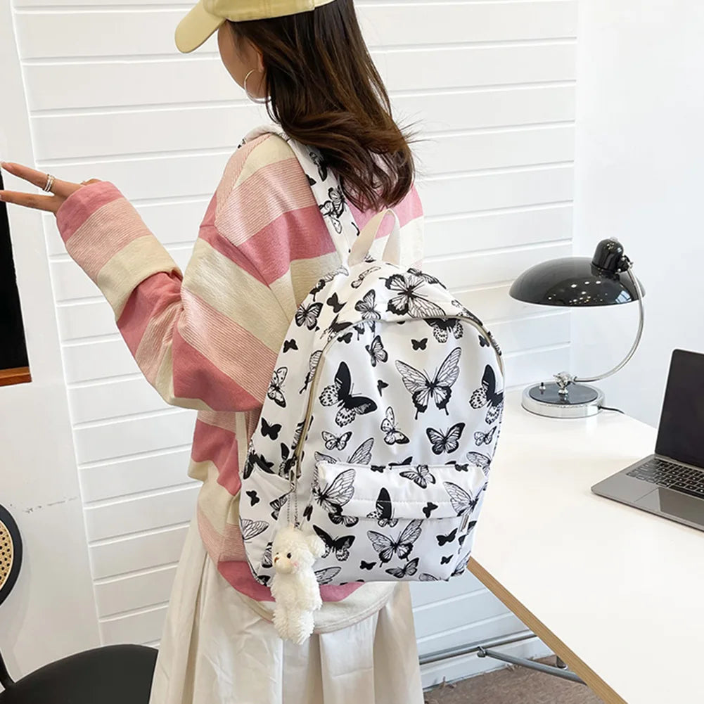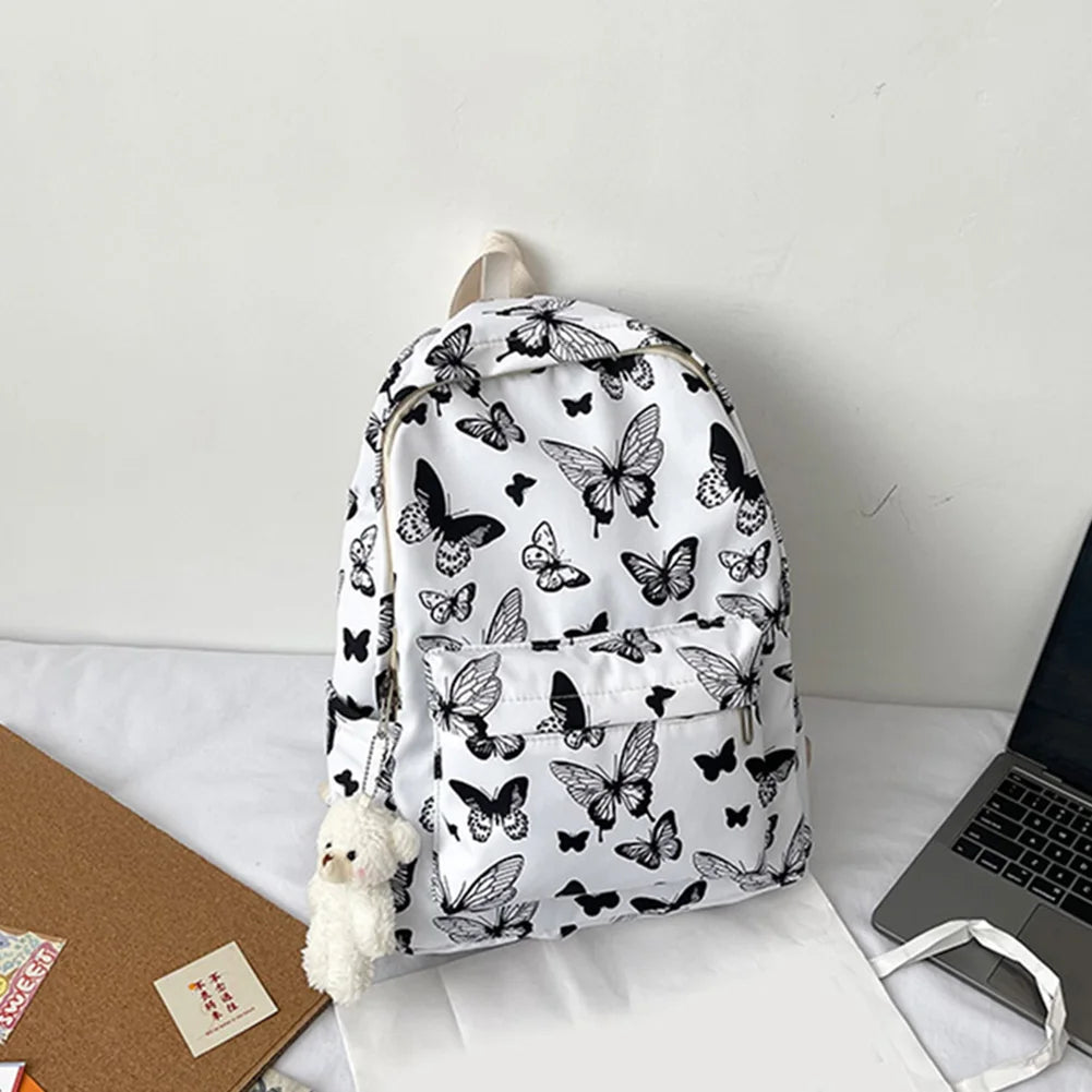 This stylish backpack features a butterfly print design, suitable for students and young women. Made of durable Oxford fabric, it is perfect for school, college, and travel.