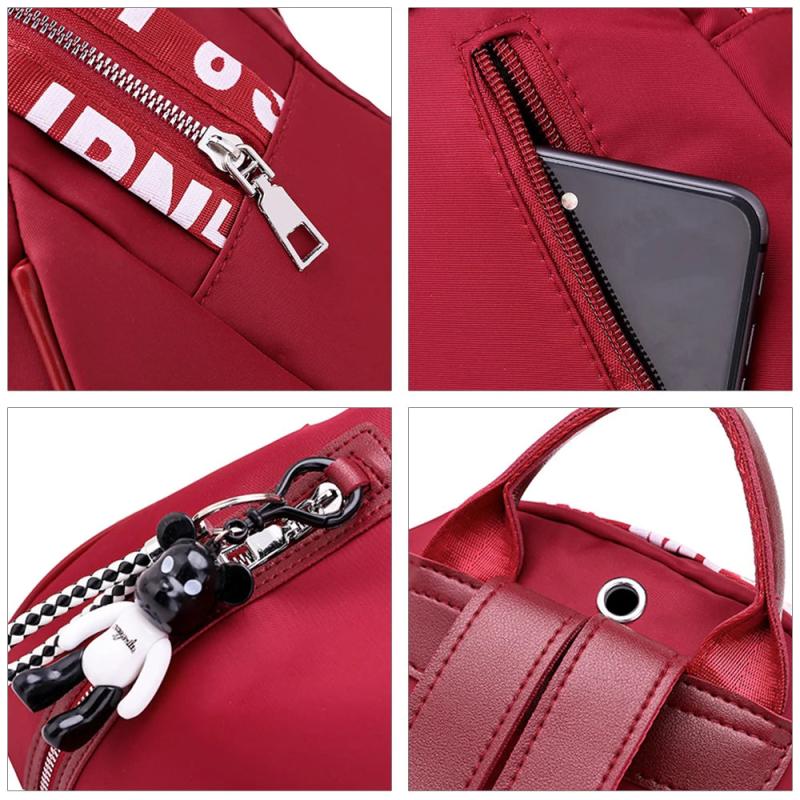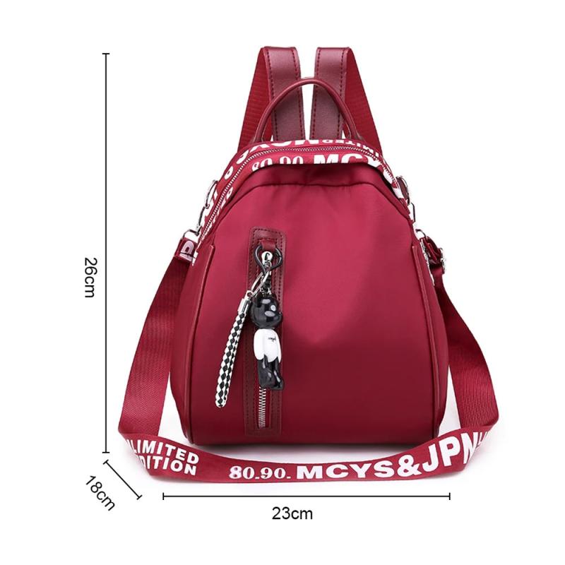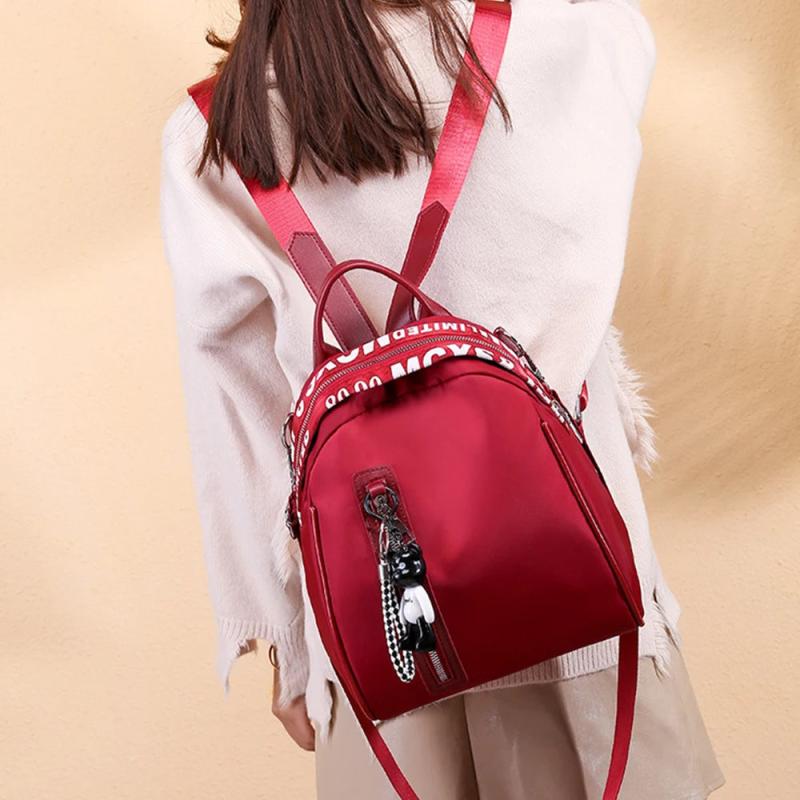 This women's backpack is made of waterproof nylon with a stylish design. It features a zipper closure and adjustable shoulder straps.