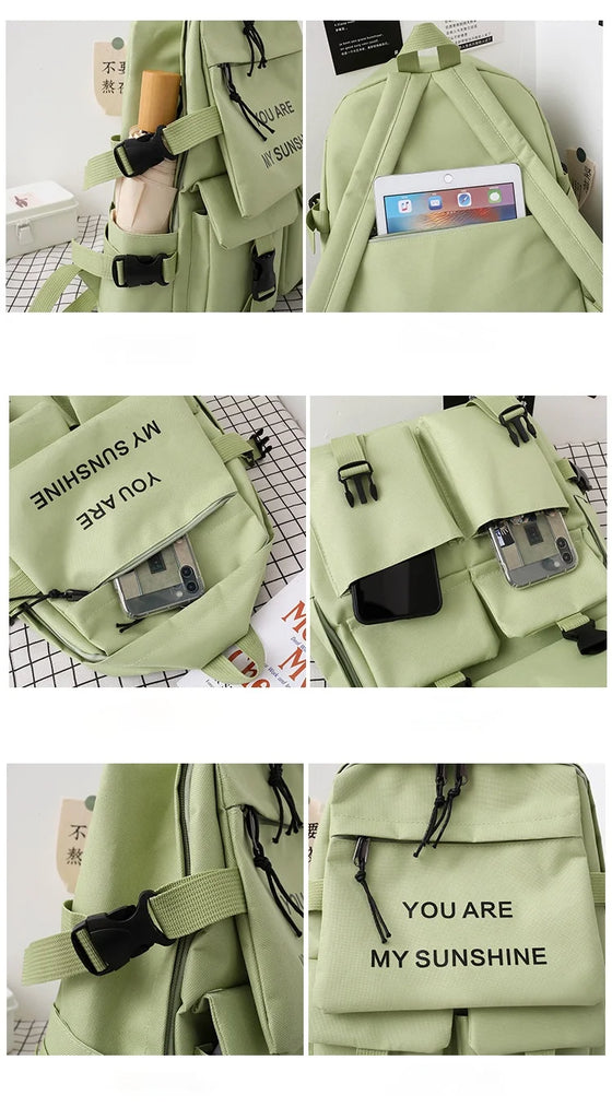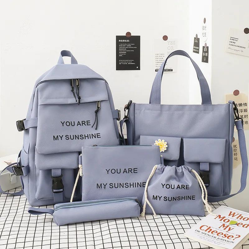 This 5PC schoolbag set includes a stylish canvas backpack suitable for teenage girls and women. Ideal for school or travel, designed for comfort and functionality.