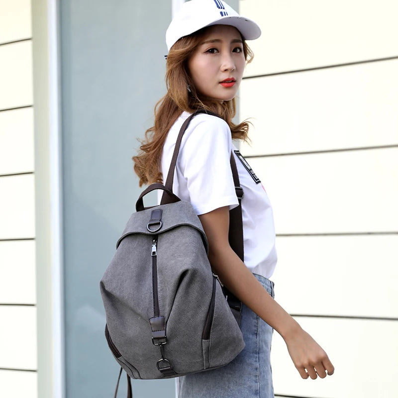 This stylish canvas backpack is designed for women on the go. It offers ample space for your essentials including a laptop, making it perfect for travel, school, or work.