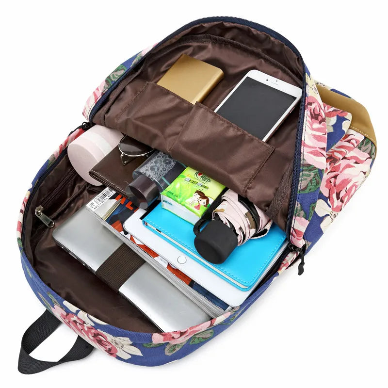 This canvas women backpack features a beautiful floral printing design and comes with USB charging function. It is great for teenagers girls, offering a large capacity for travel and a dedicated space for laptops.