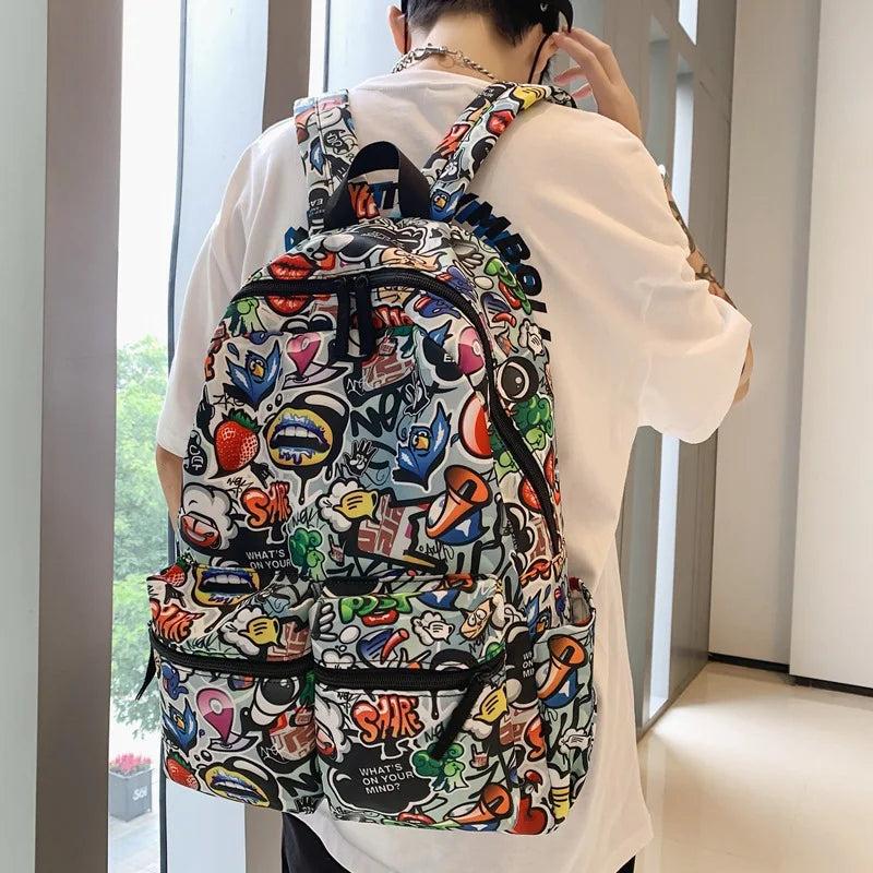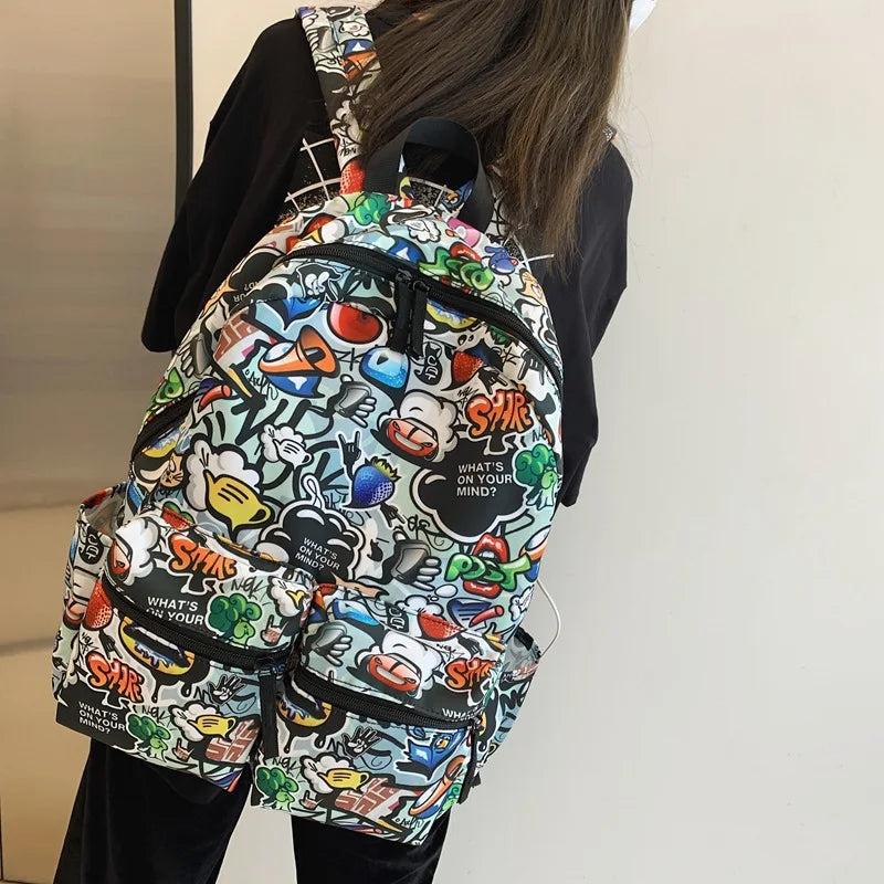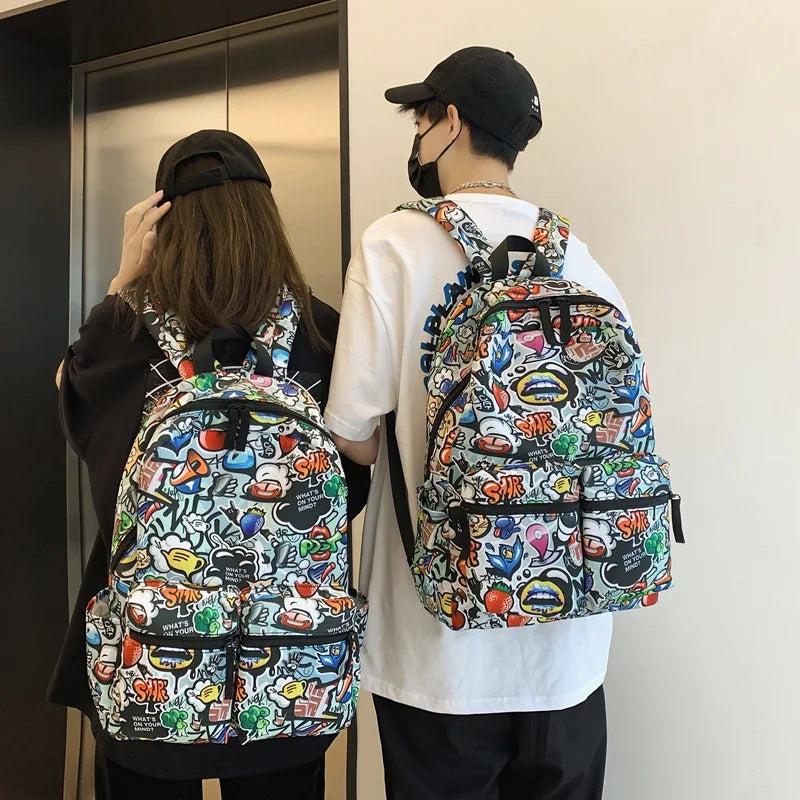 This stylish backpack features a fun cartoon graffiti printing design. It is perfect for school, travel, and everyday use. The backpack is made of high-quality waterproof material to keep your belongings safe and dry.