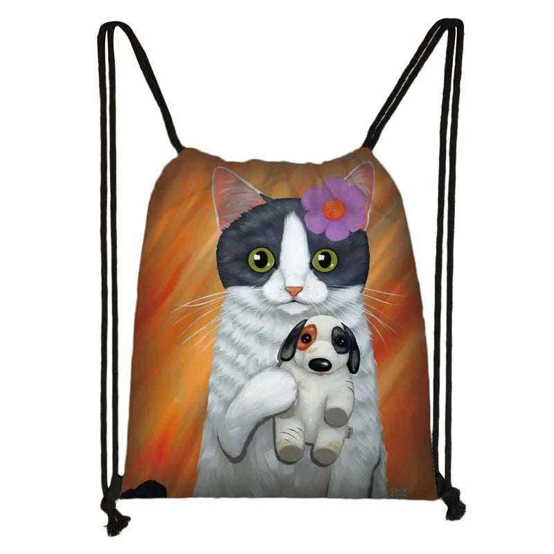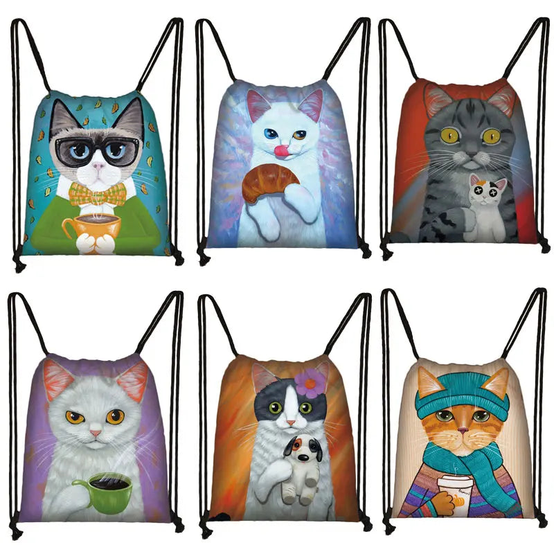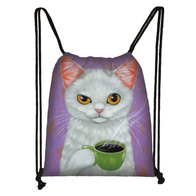 Cat Coffee Print Drawstring Bag Softback Backpack Girls Daypack