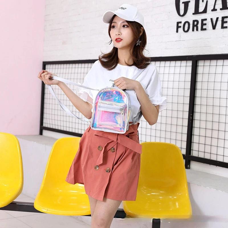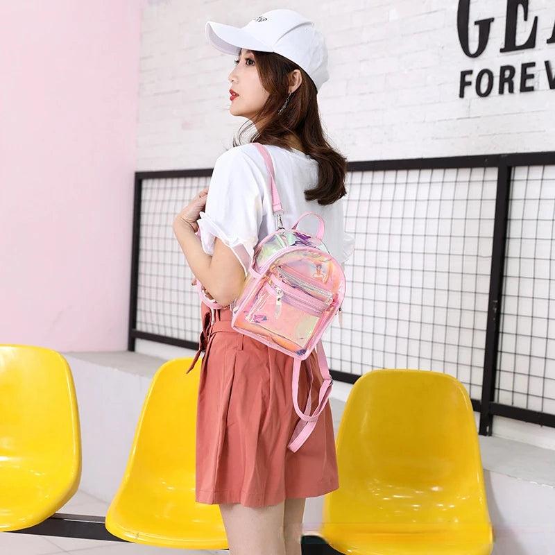 Stay stylish and trendy with this transparent PVC backpack that is perfect for school or any casual outings. The laser effect adds a unique touch to your ensemble.