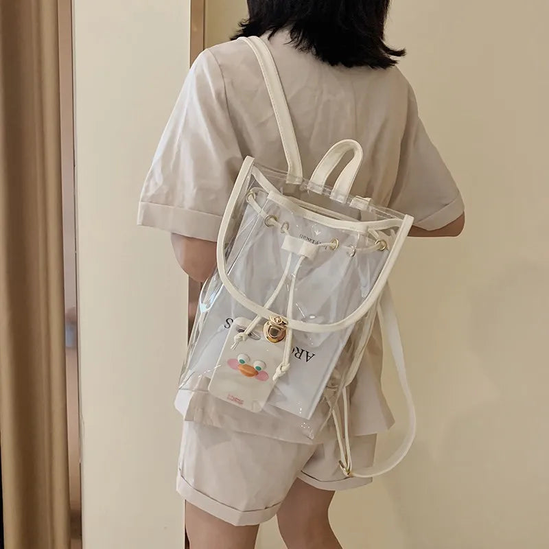 This small clear PVC women backpack is perfect for travel, school, and everyday use. It features a transparent design that's stylish and trendy, ideal for teenage girls.