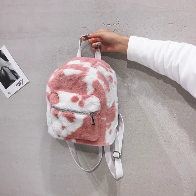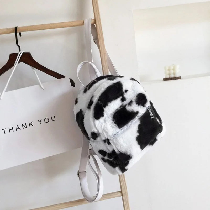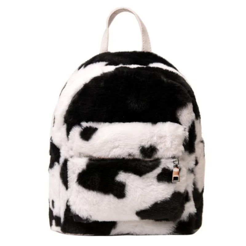 Cow Printed Plush School Backpack for Girls