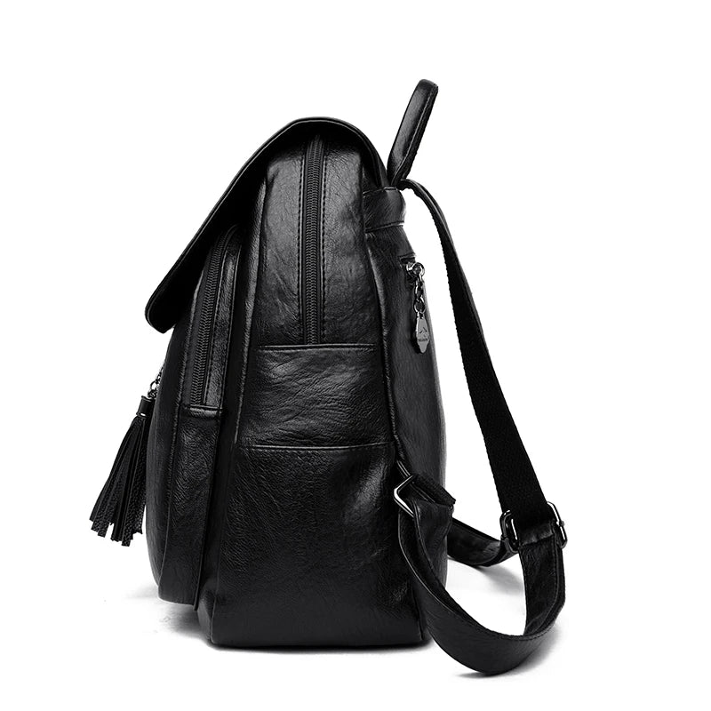 Double Tassels Women Leather Backpacks High Female Backpack Casual Daily Bag