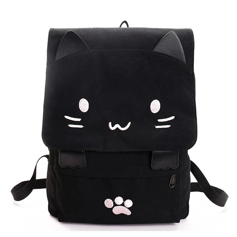 This backpack features a cute cat embroidery design on durable canvas, perfect for students and leisure activities.