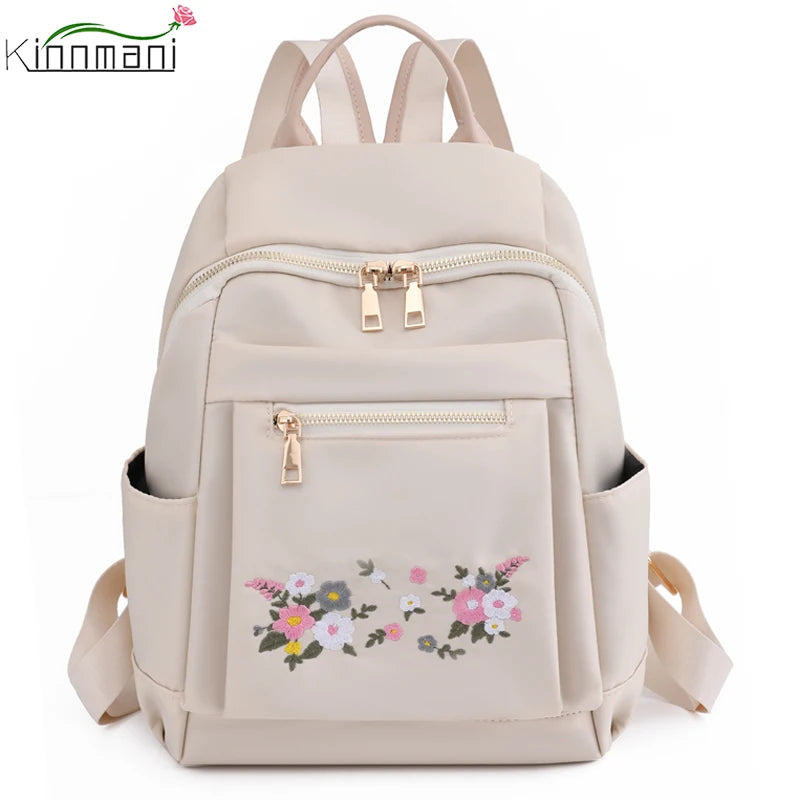 This women's backpack features a stylish flower embroidery design, anti-theft feature, large capacity for travel, made of durable nylon material. Perfect for school or casual outings.