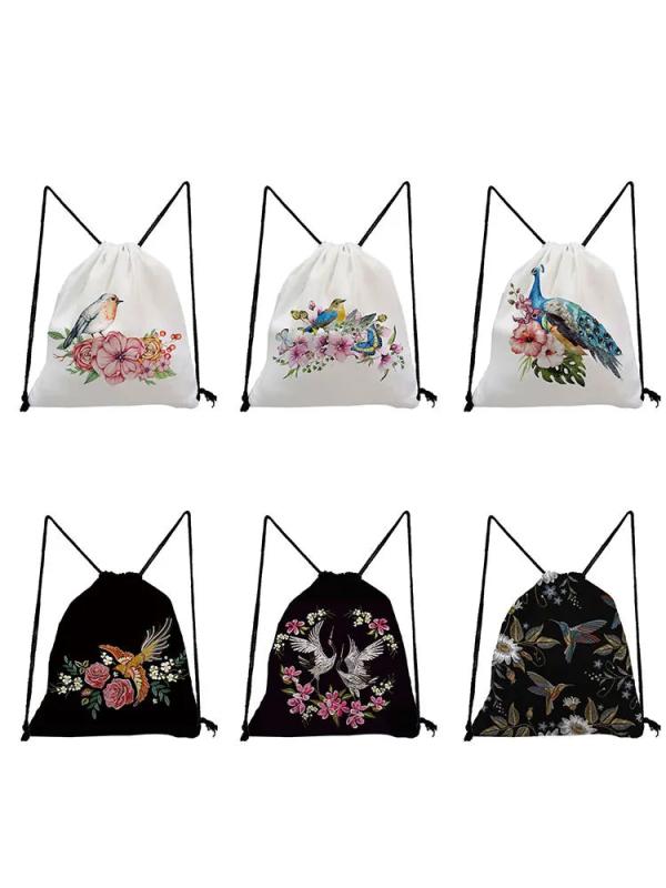 This drawstring backpack features a fun flowers and birds print, perfect for sports, gym, swimming, and travel. It's lightweight, portable, and ideal for storing your essentials.