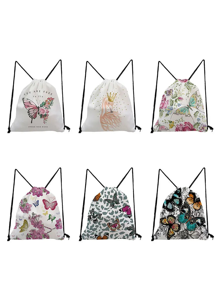 This drawstring backpack features a beautiful flowers butterfly print, making it perfect for sports, gym, swimming, travel, and storage. Portable and convenient for both women and men.