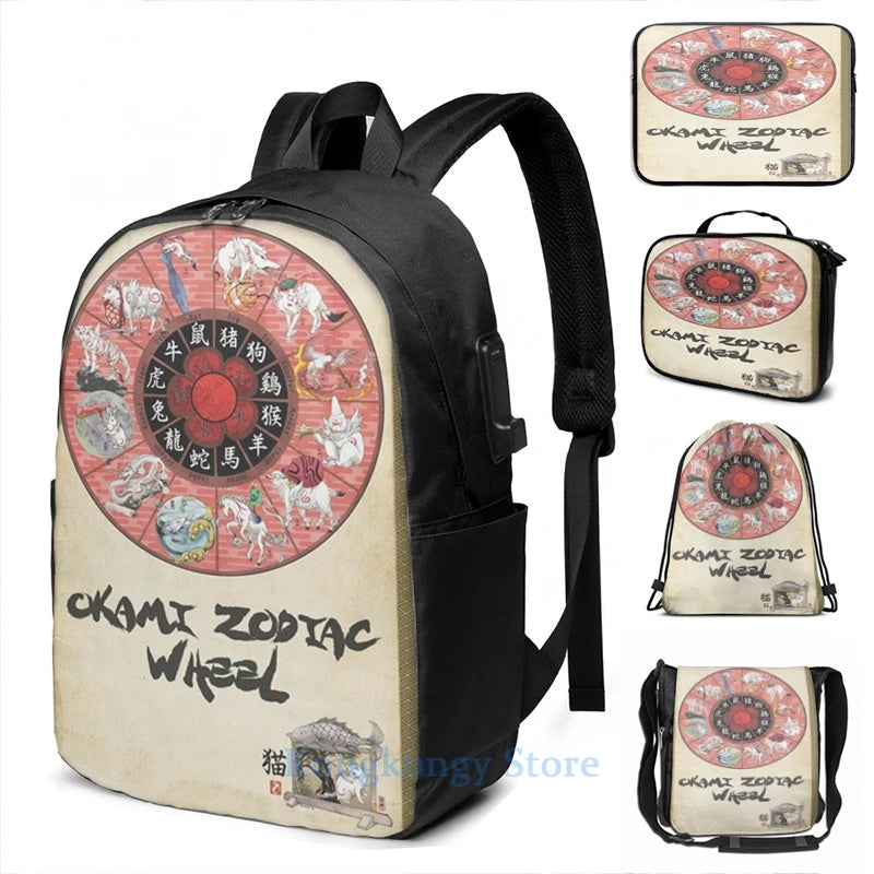 Funny Graphic Okami Zodiac Wheel USB Charge Backpack