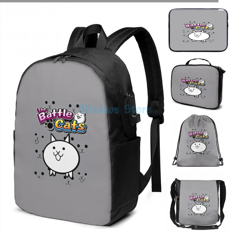 This USB charge backpack features a humorous Battle Cats design, suitable for both men and women. Perfect for school, work, or travel.