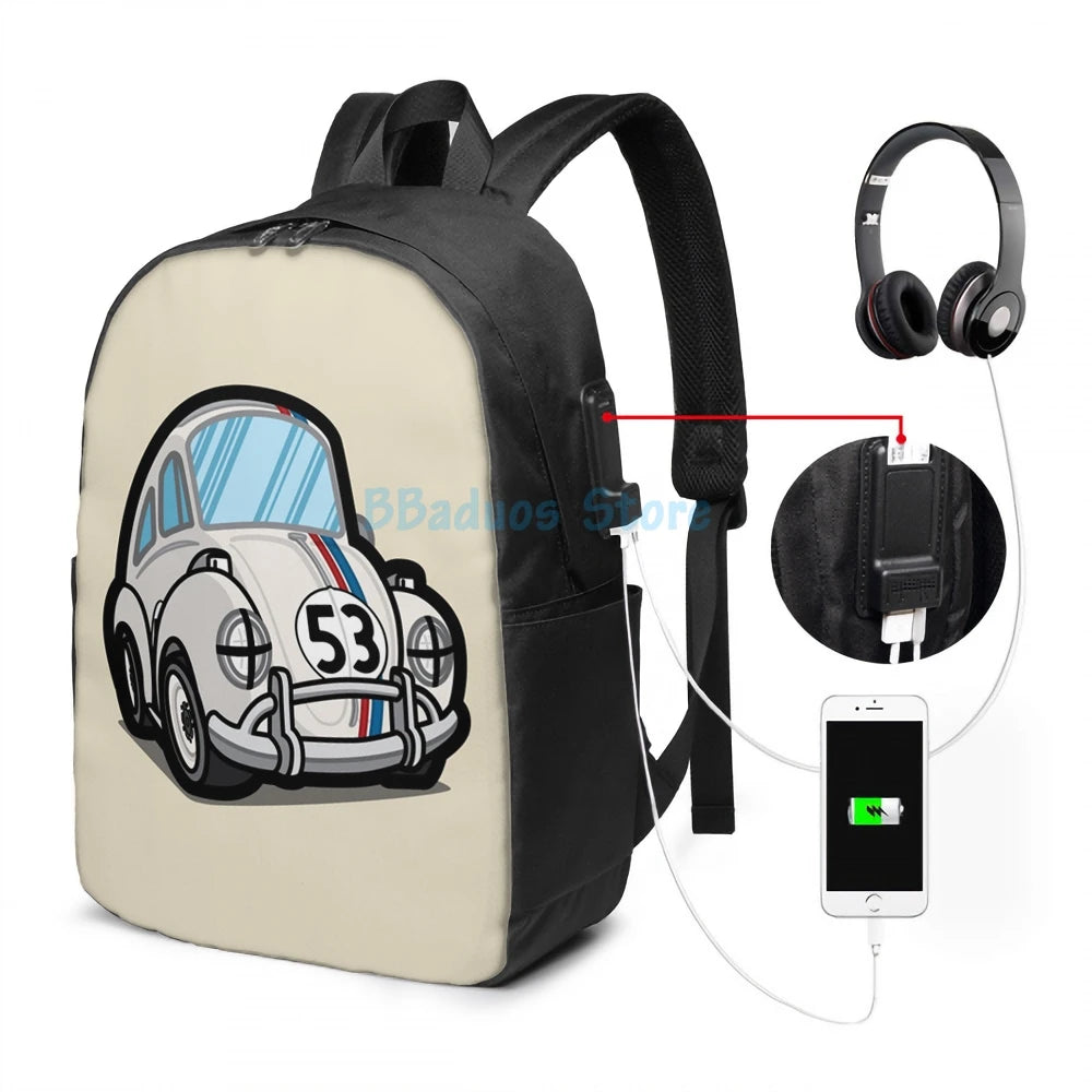 Funny Racing Herbie USB Charge Backpack School Travel Laptop Bag