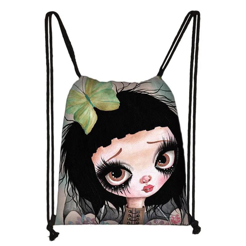 This drawstring bag features a gothic cartoon girl design, perfect for casual use and carrying essentials.