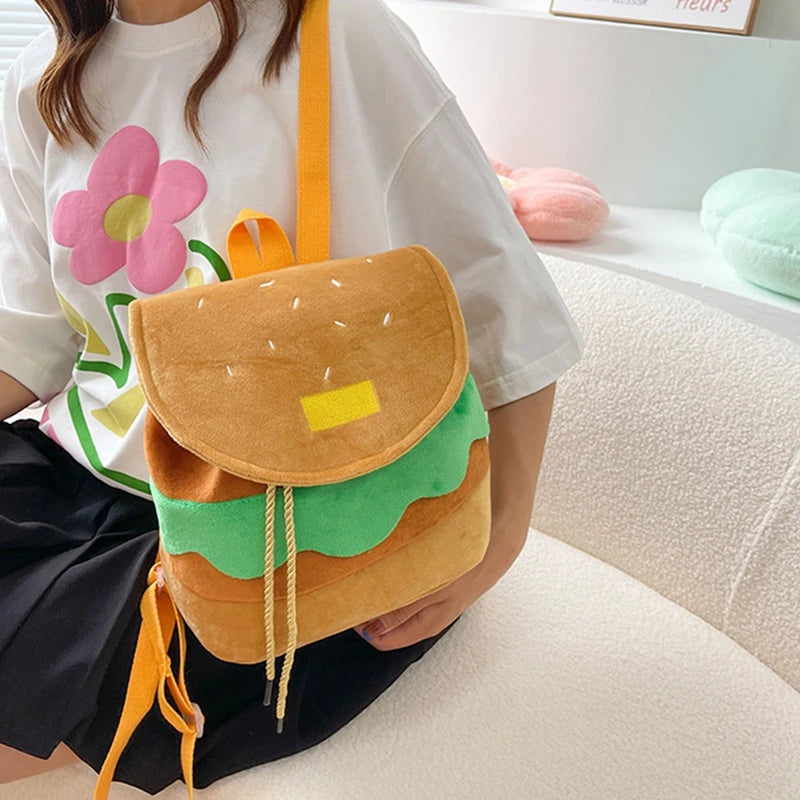 This unique backpack is designed in the shape of a hamburger. It is made of high-quality materials, features an adjustable drawstring closure, and can be used for daily activities.