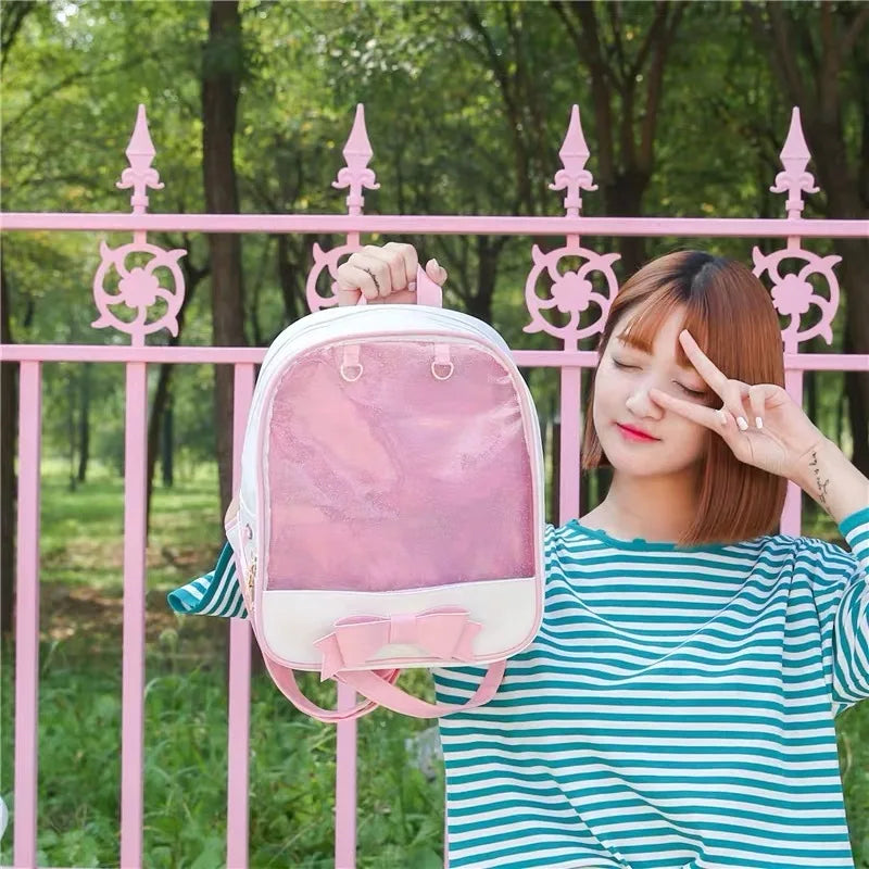 This stylish Harajuku mini backpack features a bow-knot design and clear transparent material, perfect for teen girls to use as a school bag or casual accessory.