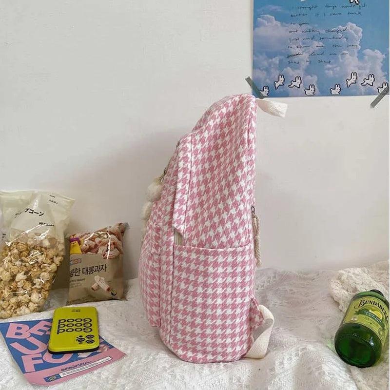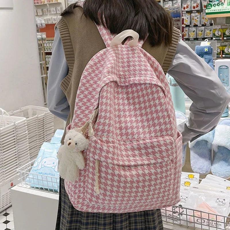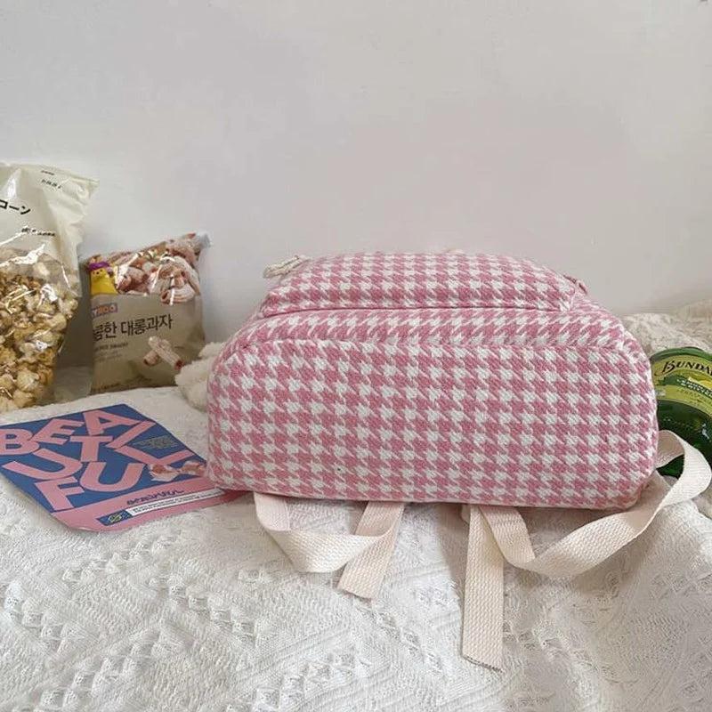 Houndstooth Canvas Backpack Women Student Sweet Large Capacity Harajuku Bag