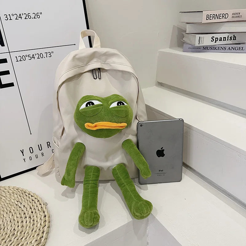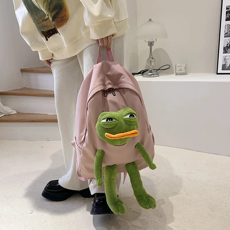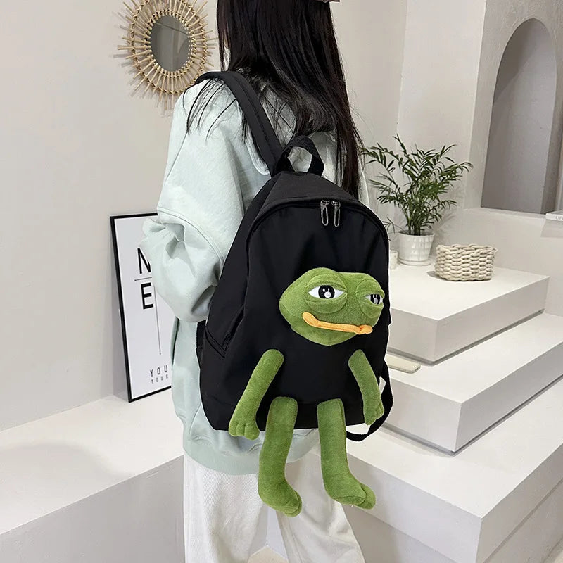 This funny frog backpack featuring a Japanese cartoon girl design is perfect for campus and school use. It offers a large capacity for carrying books and essentials.