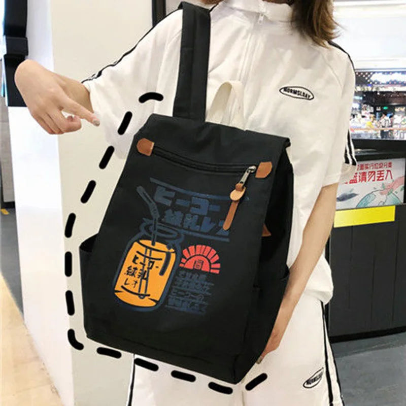 This stylish backpack features a unique Harajuku student school bag print, perfect for students or travelers. It offers ample space for a laptop, books, and other essentials.