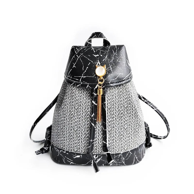 This female woven backpack is perfect for school or travel. It features a decorative design and offers a large carrying capacity.