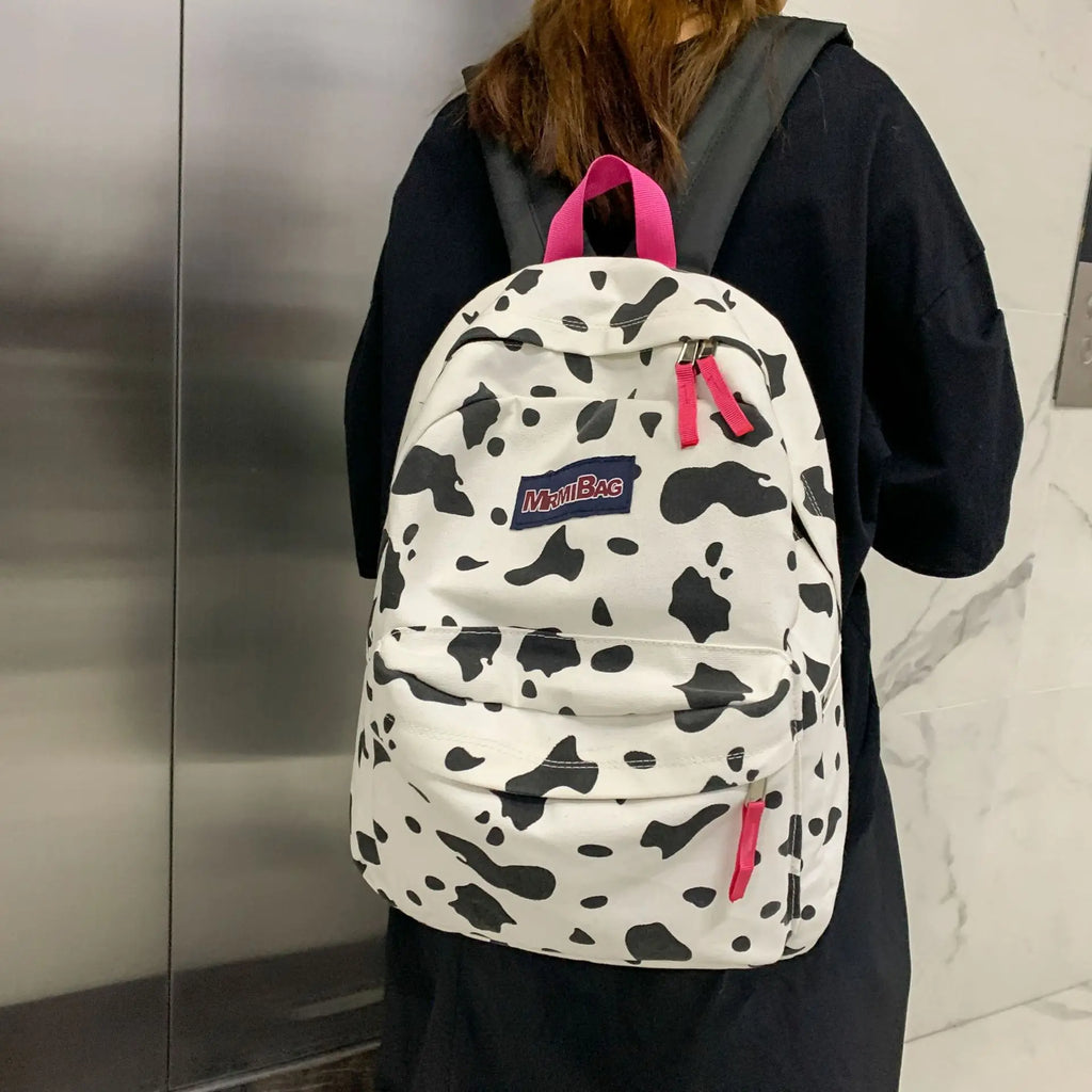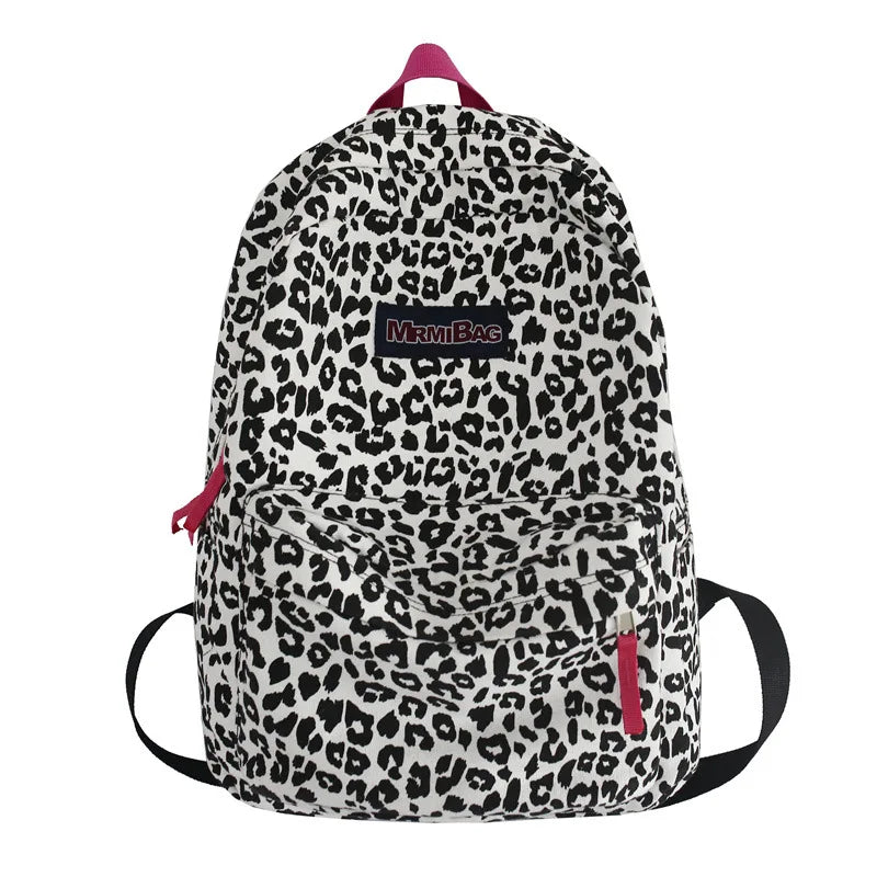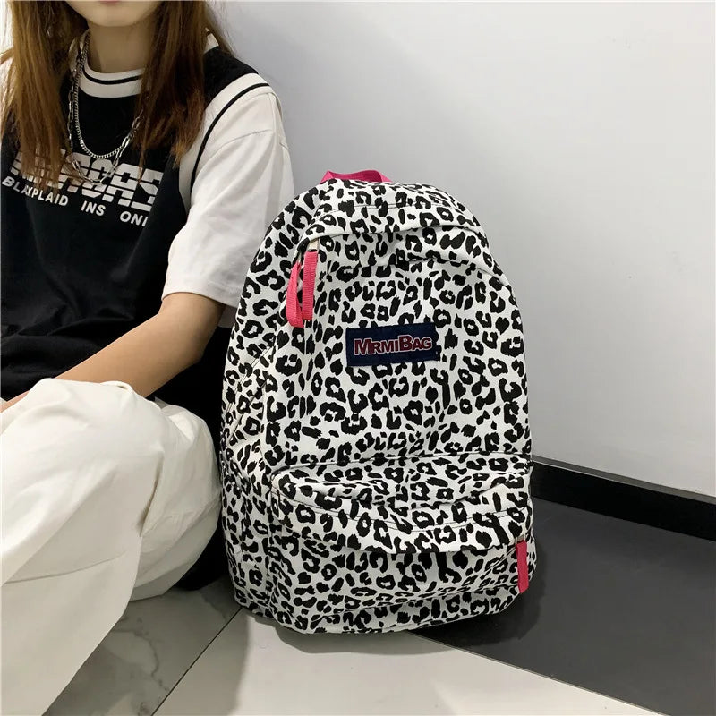 This stylish women's backpack features a trendy leopard pattern on durable canvas material. Perfect for students and teenagers, it's ideal for casual outings and travel.