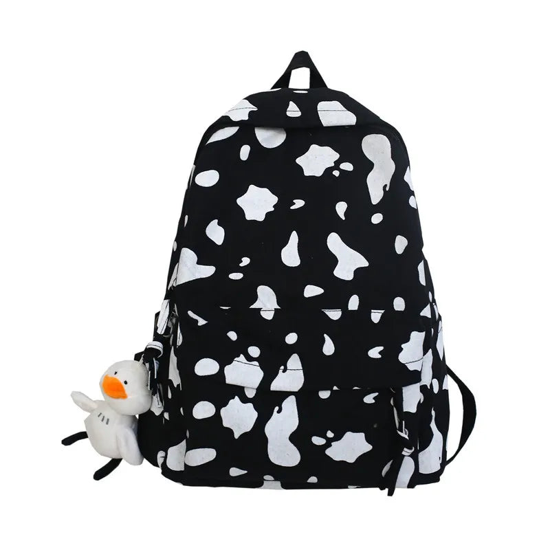 This stylish backpack is perfect for teenage girls, with its milk cow print design and durable canvas material. Ideal for school or travel.