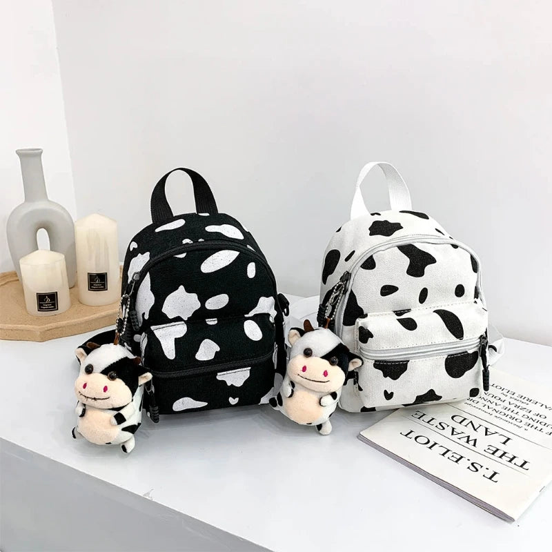 This stylish mini canvas daypack features a cow print design and comes with a plush pendant. Perfect for outdoor travel, shopping, and everyday use.
