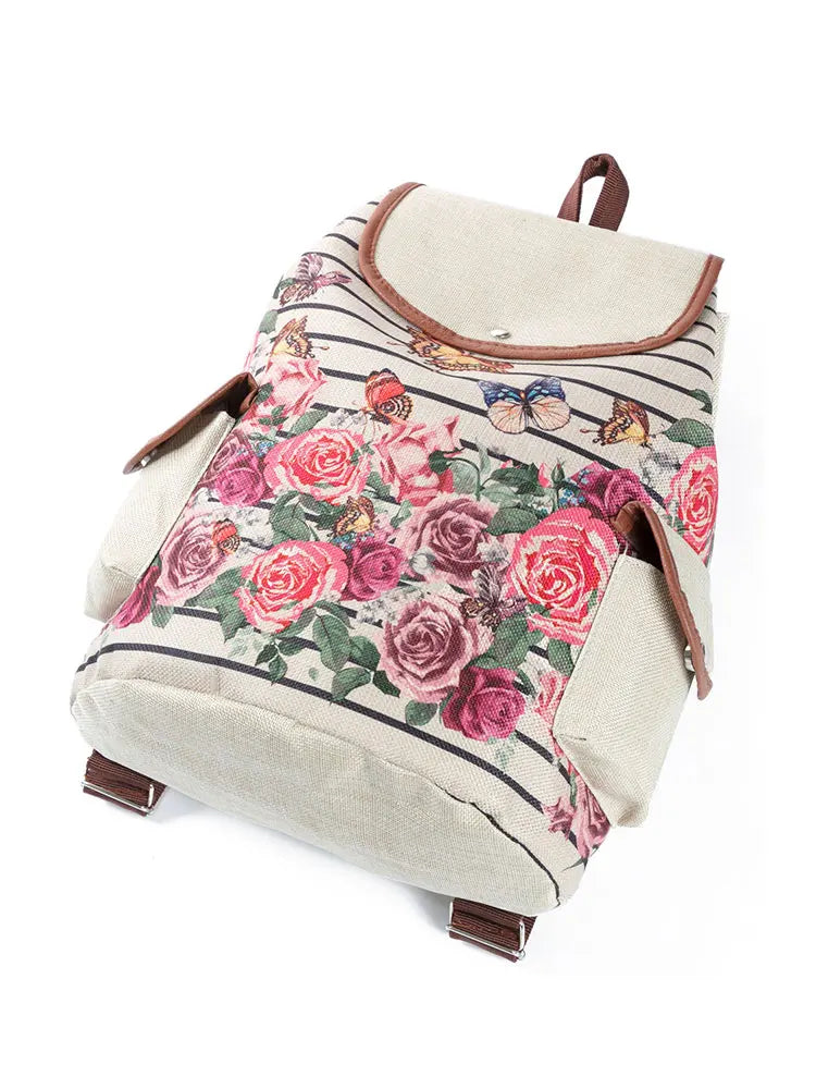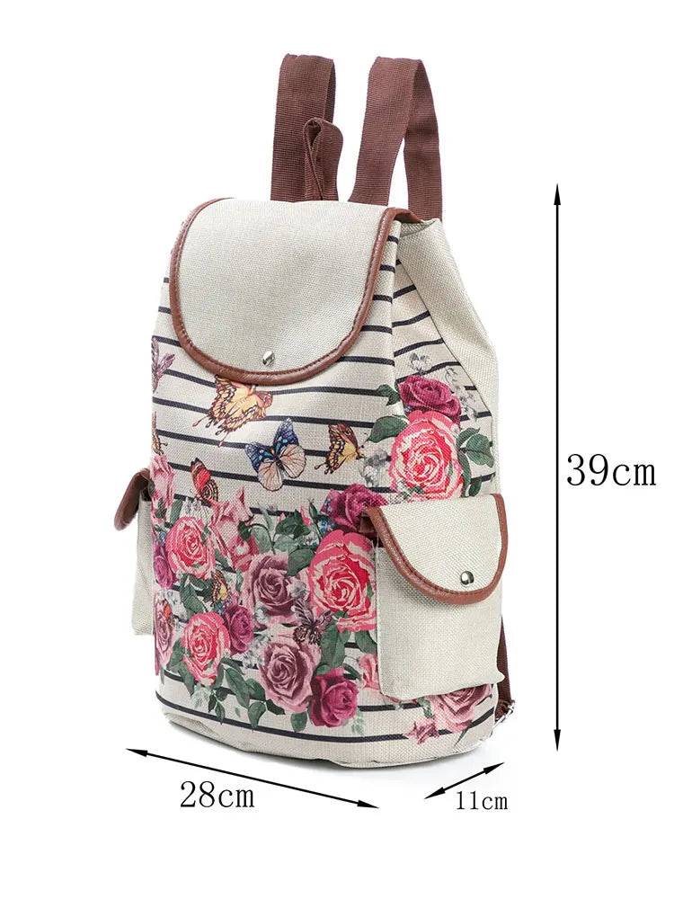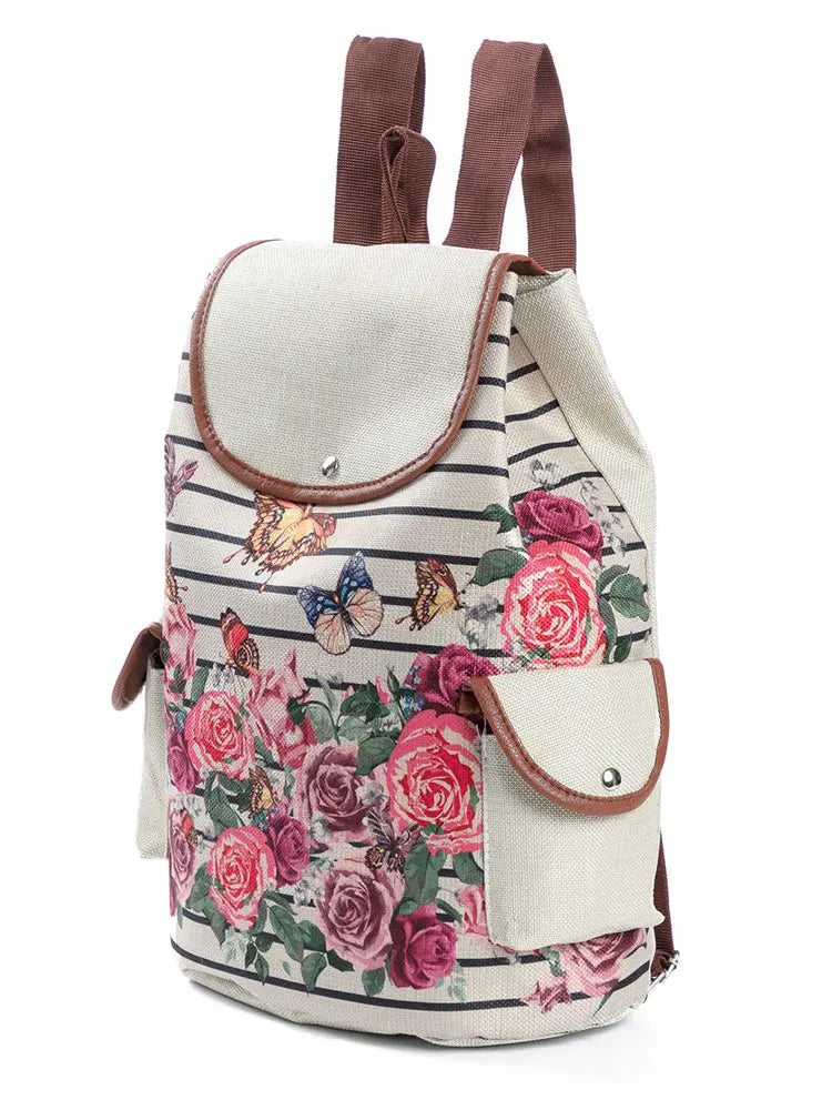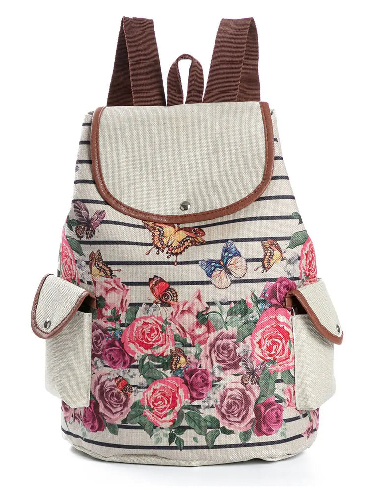This canvas backpack features a beautiful flower and butterfly design, perfect for women on the go. It's a stylish and practical travel rucksack.