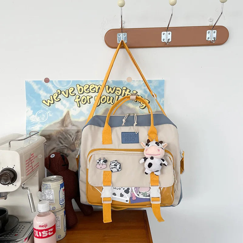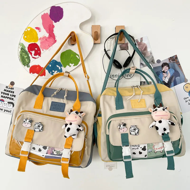This lovely backpack is perfect for teenage girls. It is portable, stylish, and multifunctional. Ideal for school or travel, this backpack features a cute cow design and a badge. The perfect accessory for any girl on the go.
