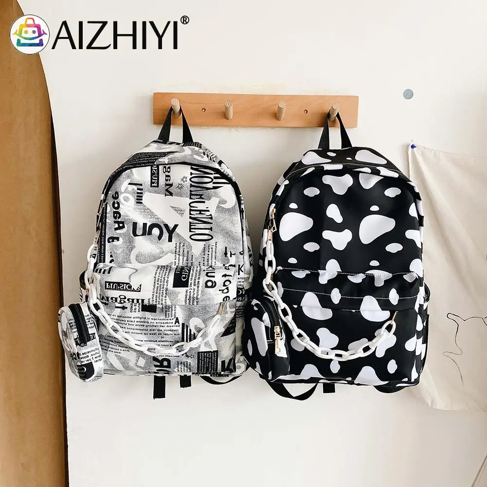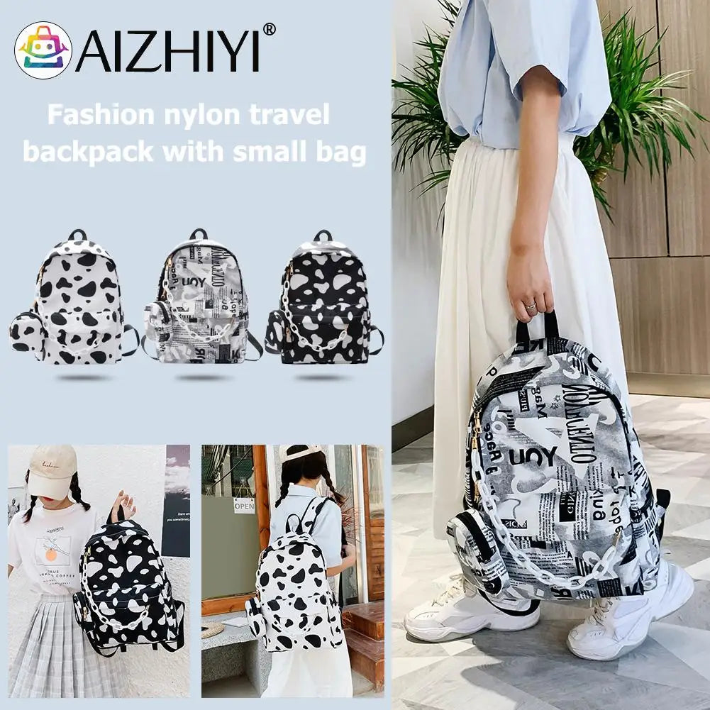 This stylish nylon backpack is perfect for students and girls. It features a cow letter print design and is ideal for daily travel. Includes a pouch for extra storage.