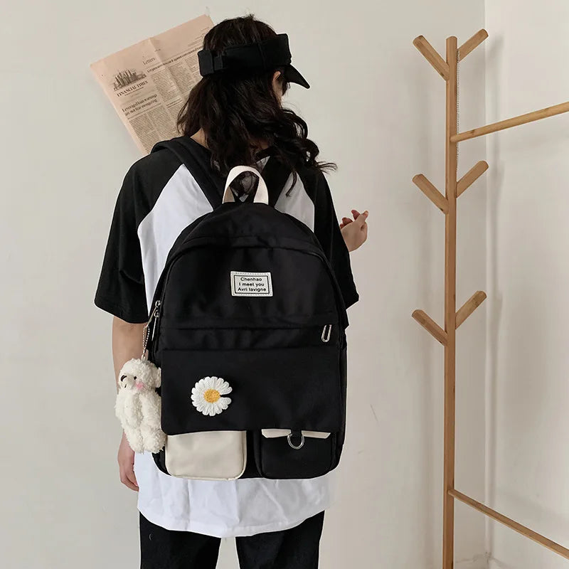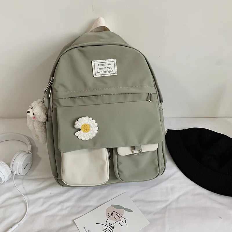 This preppy style women's rucksack is made of waterproof nylon, perfect for teenage girls. It features a cute doll pendant and offers functionality and style.