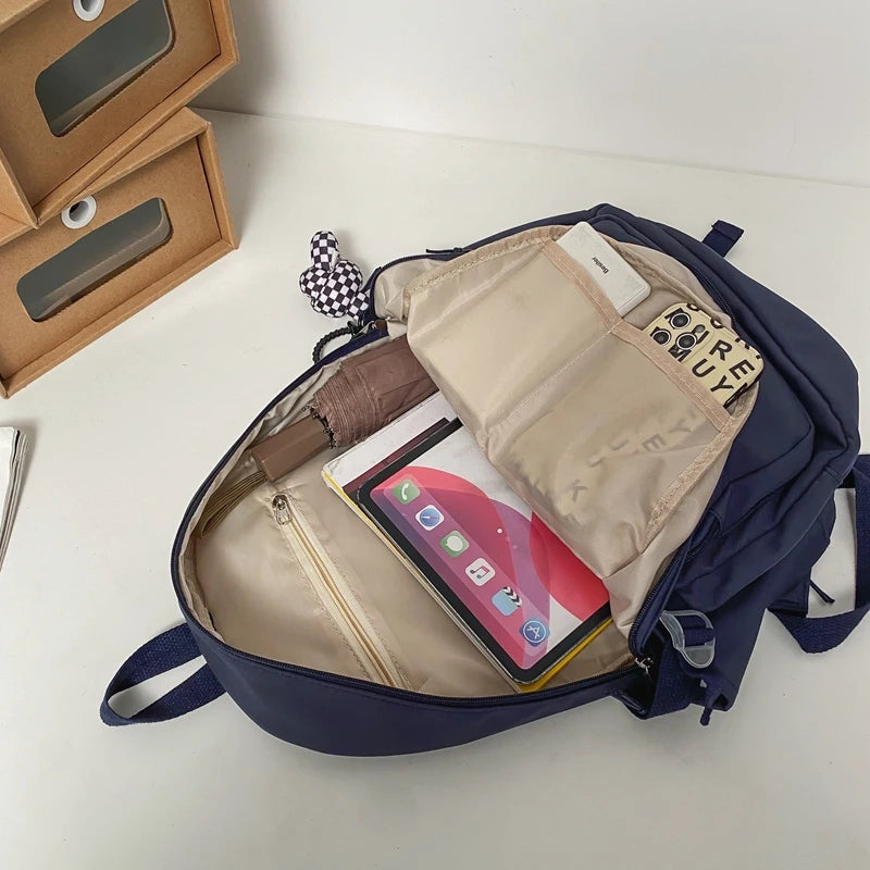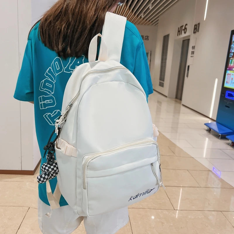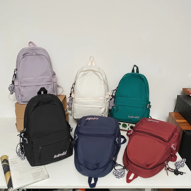 Stay organized in style with this nylon backpack featuring letter embroidery. Perfect for female students and travelers, this backpack is a must-have accessory.