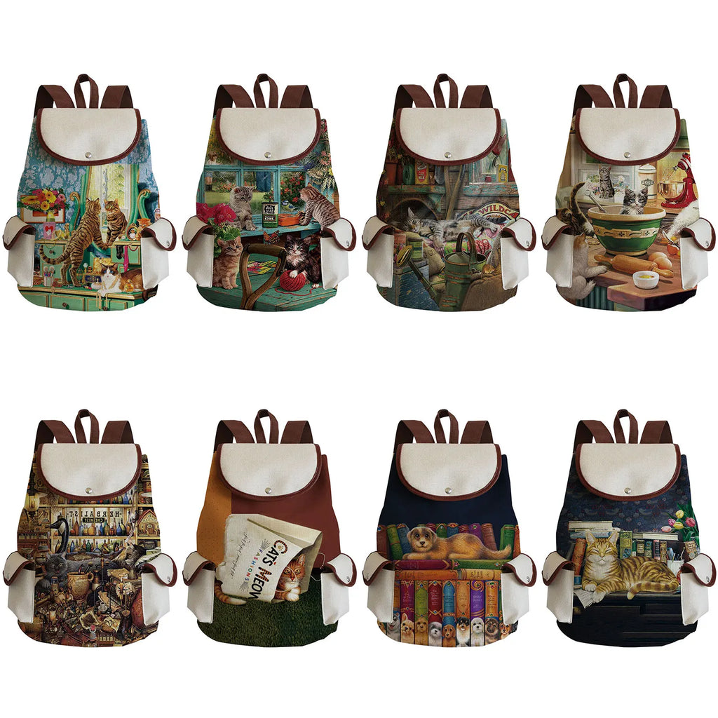 Stay stylish and organized with this portable linen backpack featuring an oil painting cat print. Perfect for university, travel, or daily use.
