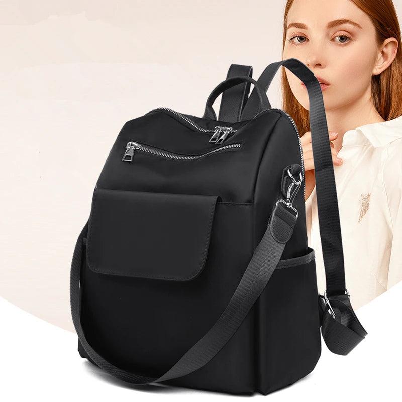 This backpack is made of durable Oxford cloth, designed for women and teenagers. It features multiple pockets for easy organization and convenience. Perfect for school or everyday use.