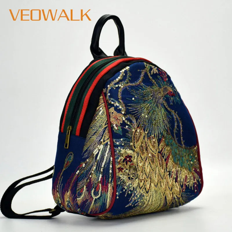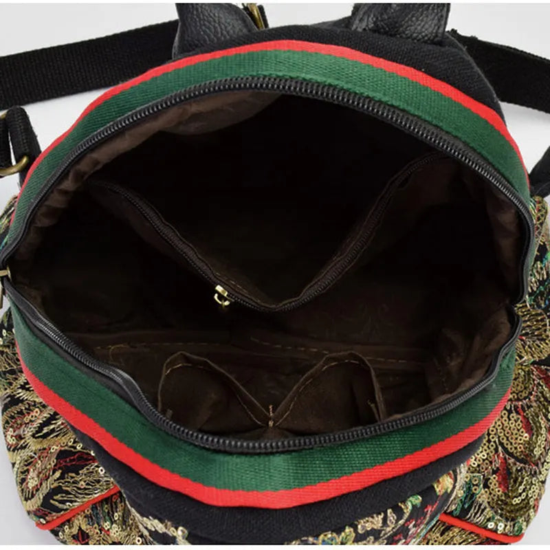 Peacock Sequins Embroidered Canvas Backpack for Women
