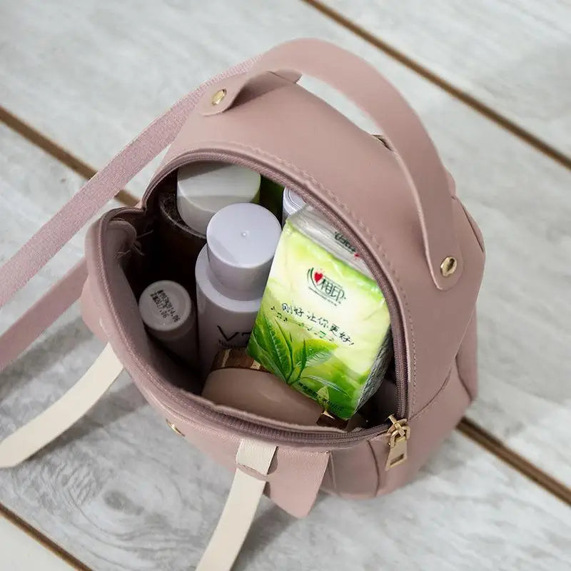 This all-match pink mini crossbody backpack is perfect for women and girls. It features a stylish patchwork design and is water-proof, ideal for school or casual outings.