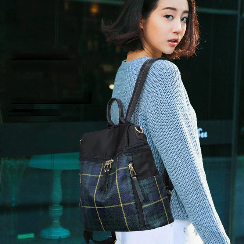 This stylish backpack is made of high-quality plaid nylon material, perfect for women on the go. It features a spacious main compartment for books and a separate padded sleeve for a laptop.
