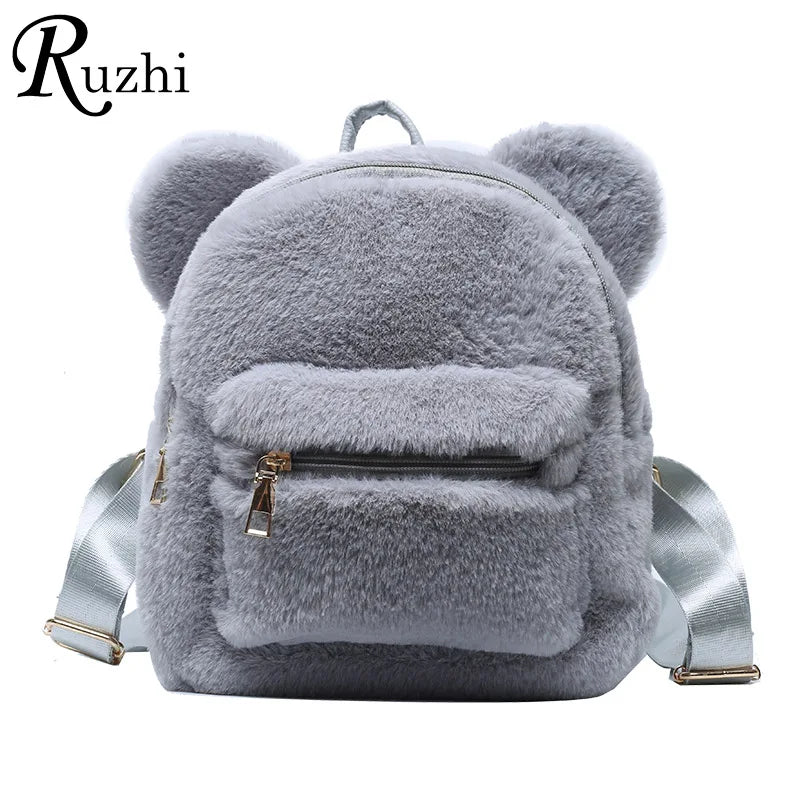 Plush Women's Backpack With Bear Ears Fur Shoulders Bag Furry Women Bag
