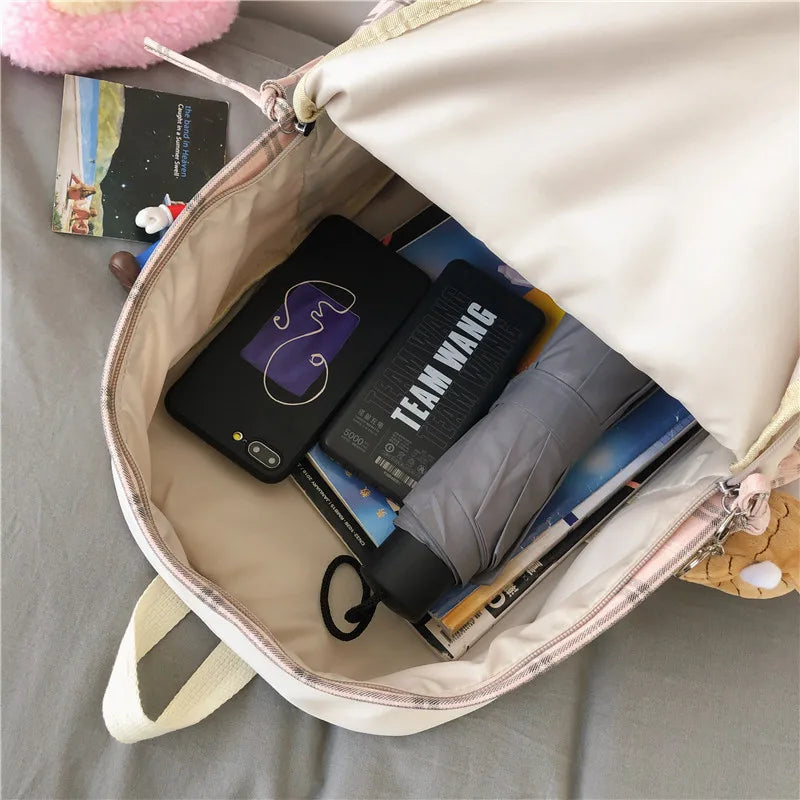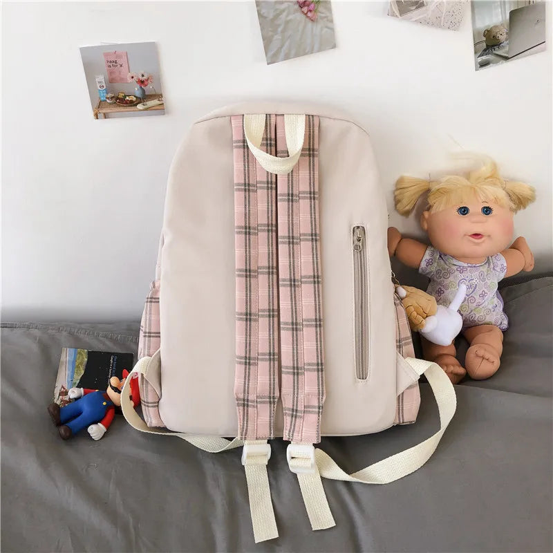 This stylish backpack is perfect for teenage girls, featuring a panelled design and made of waterproof nylon. It is ideal for school or travel, with a lovely plaid pattern that adds a touch of charm.