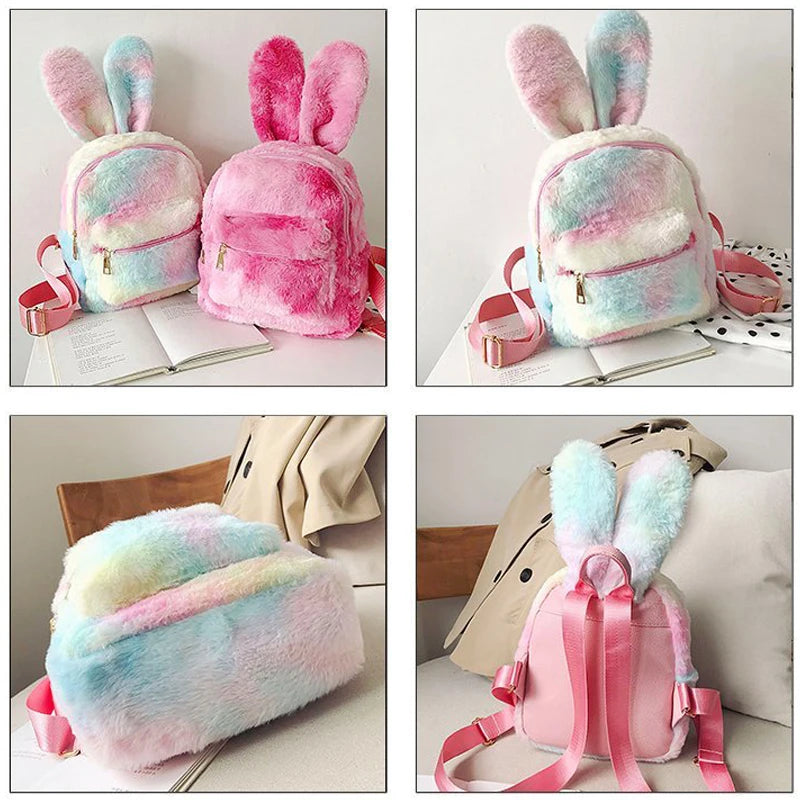 Rabbit Ears Tie Dye Plush Backpack for Women Furry Mini Backpack
