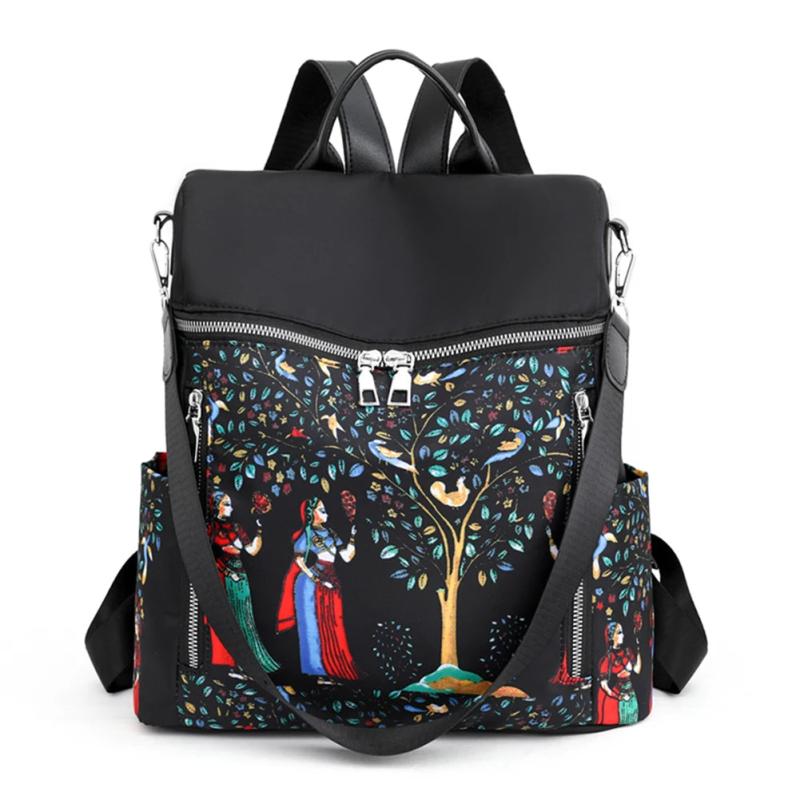 This stylish backpack is designed for women with a retro ethnic pattern. It's made of durable Oxford fabric and features anti-theft design to keep your belongings secure. Perfect for school, travel, or everyday use.