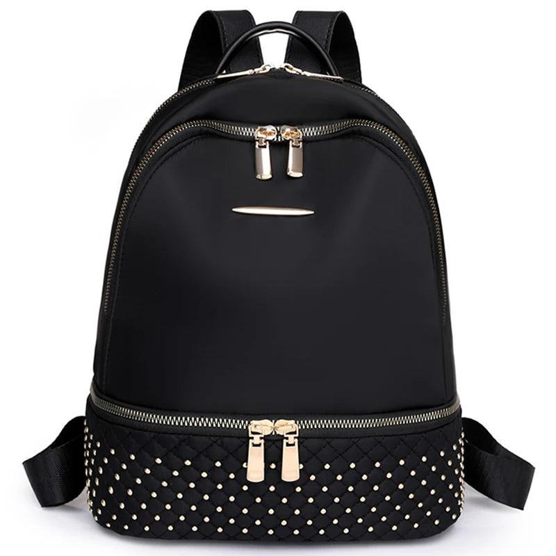 This retro women backpack is made of Oxford Cloth material and features a rivet design along with an anti-theft pocket for added security. It can be worn as a shoulder bag.