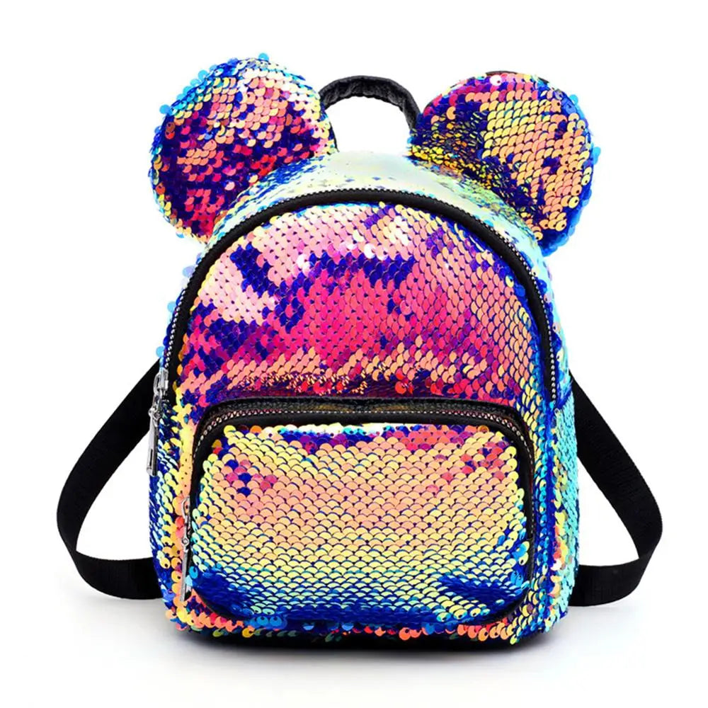 This cute mini backpack features adorable mouse ears design with sequins, perfect for little girls. Ideal for school, travel, or casual outings.