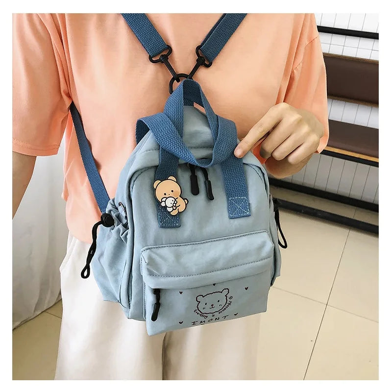 This small canvas mini backpack is perfect for women of all ages. It is waterproof and great for travel, school, or as a tote. The backpack features a shoulder strap for easy carrying.
