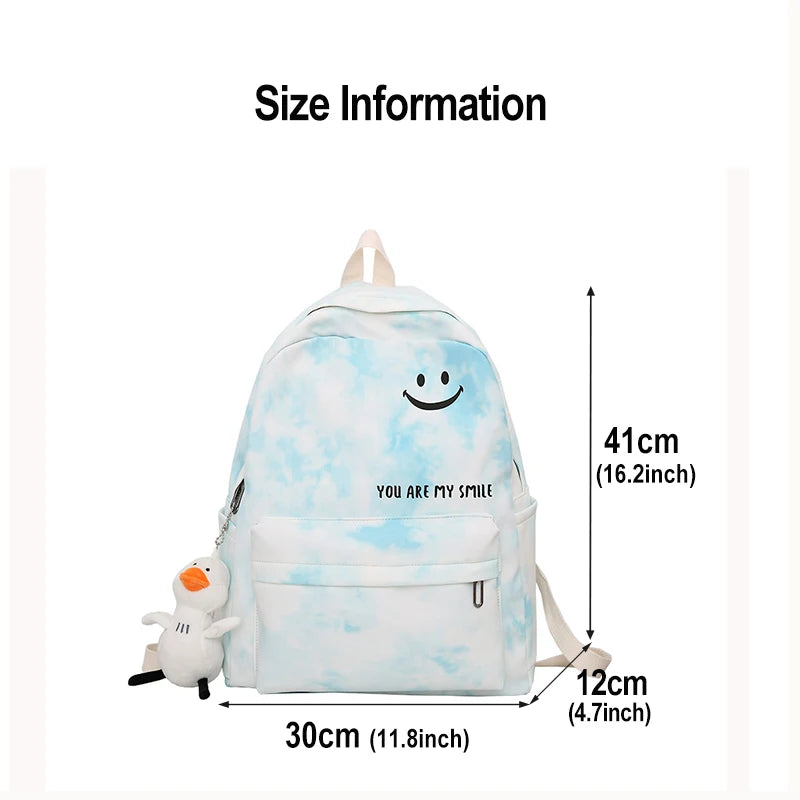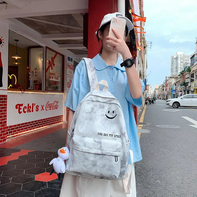 Stay stylish with this Harajuku junior school student backpack, perfect for casual travel. Features a fun smiley print design.