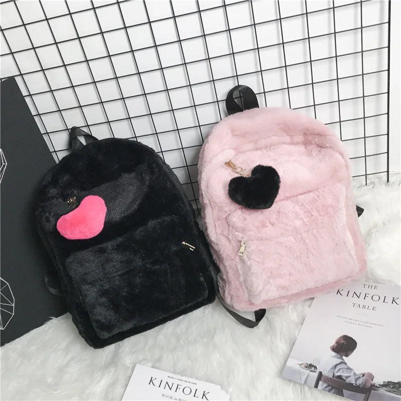 Stay cozy and stylish with this big faux fur backpack featuring a heart pendant. Perfect for the winter season!