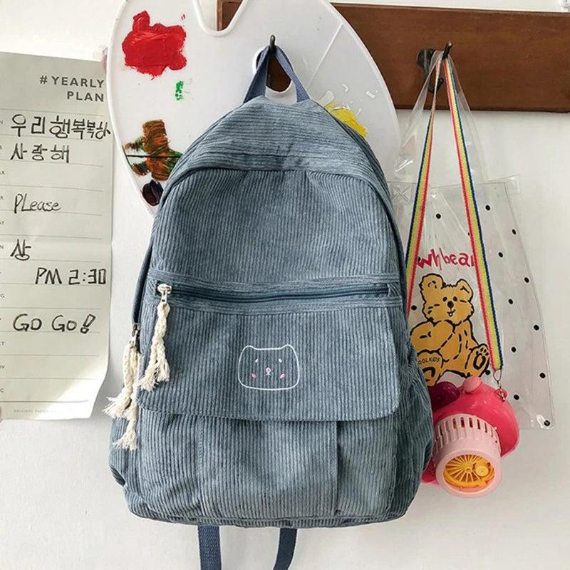 This corduroy women backpack is perfect for female students, featuring a trendy design that is ideal for teenagers.