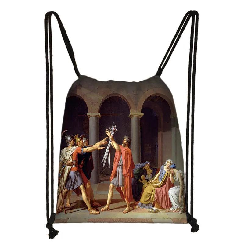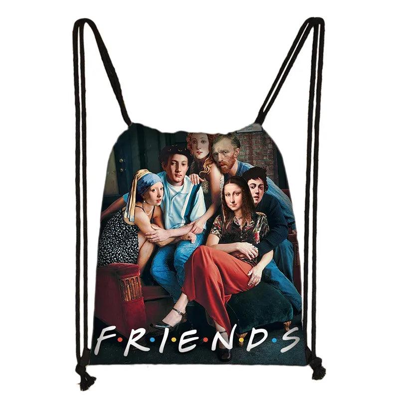This drawstring bag features a humorous twist on the Mona Lisa and Van Gogh's Starry Night oil paintings. It's a fun and stylish storage solution for women and girls.