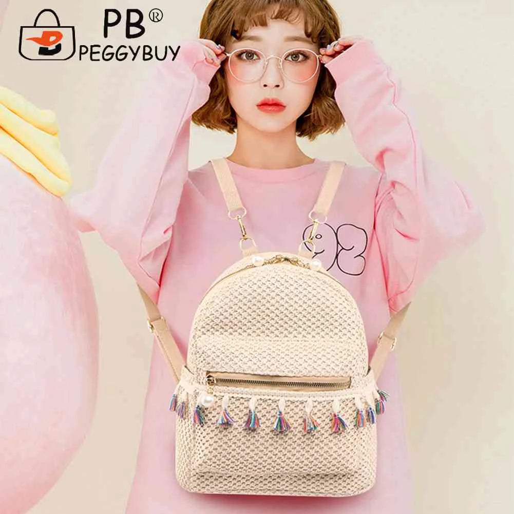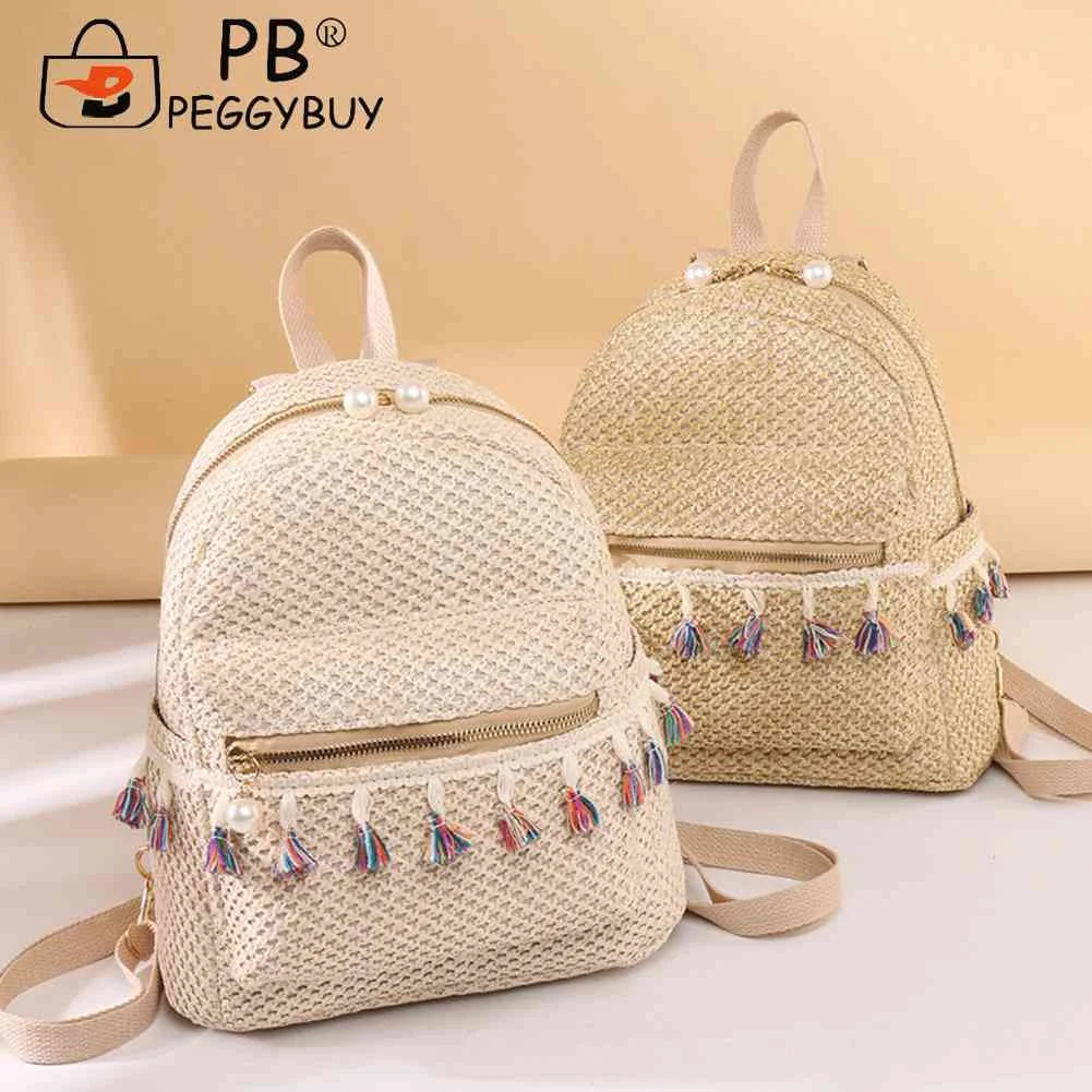 Straw Women Backpack Weave Tassel Beach Shoulder Schoolbag